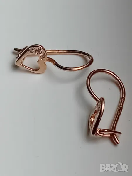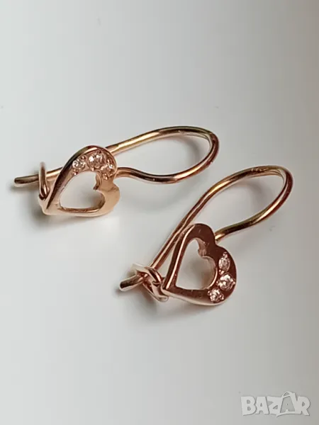 Много нежни и красиви.От розово злато 585 с тегло 0,95 гр. и с фианити.Закопчаване руско и стабилно.Точно 1,6 см. са.В състояние ,което става и за подарък.Крайна цена.