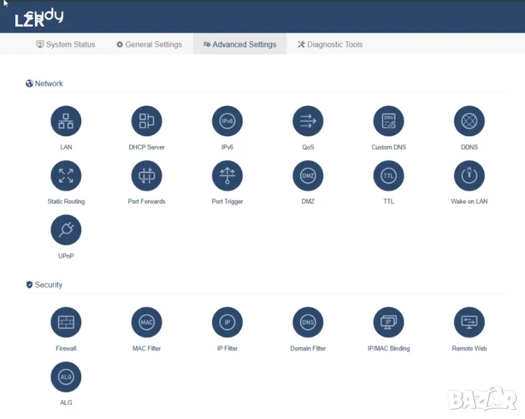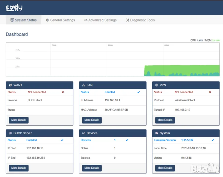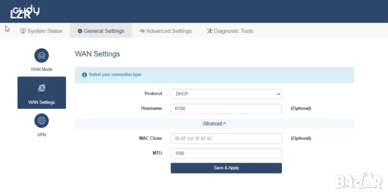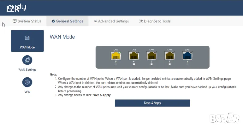 Изключително лесно се конфигурира за няколко доставчика, с поставяне на 1 отметка порта може да се сменя от LAN na WAN.