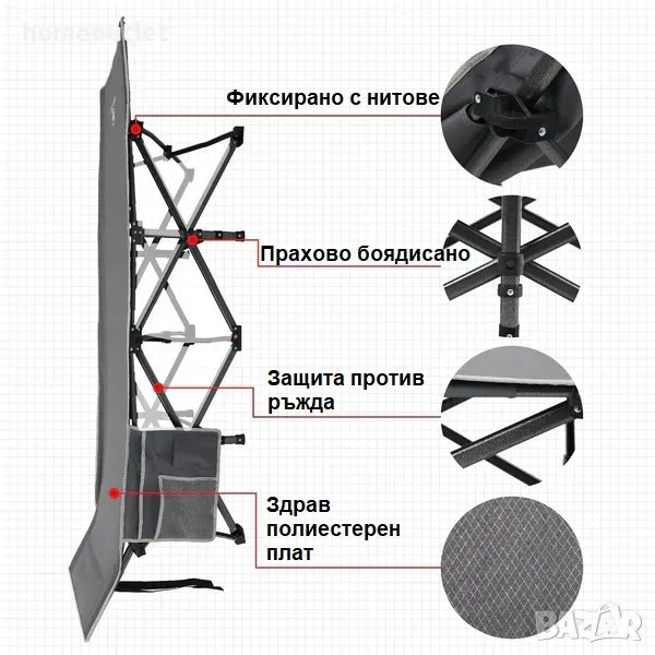 Изработено от висококачествен материал. Стоманената тръбна рамка е с висока якост и триъгълна структура. Издръжливата стоманена рамка и текстилната част, изработена от плат оксфорд са с товаропоносимост до 270 кг..