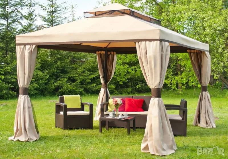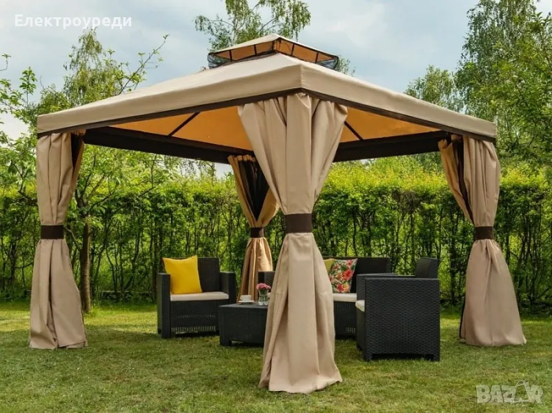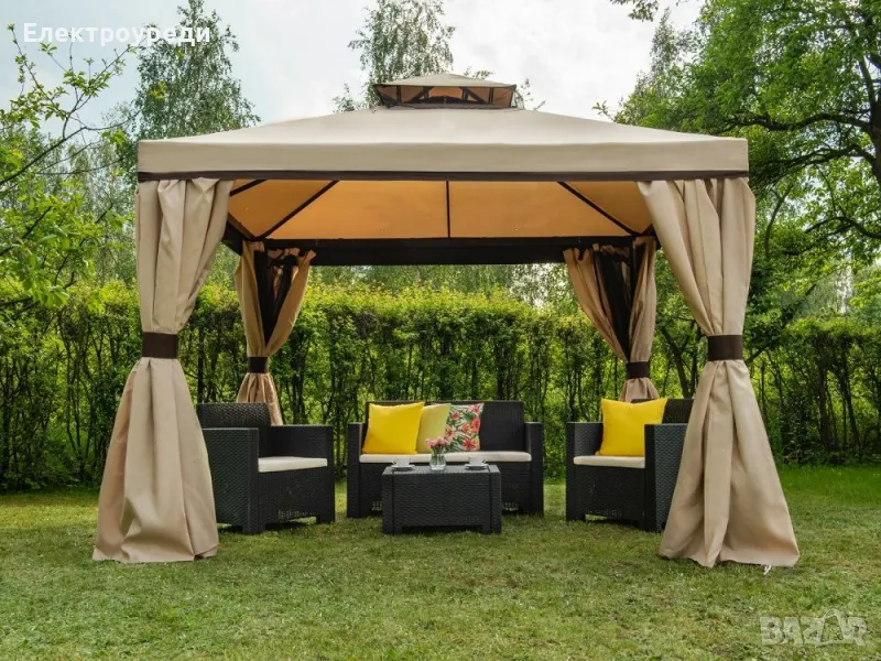 Осигурете си пълен подслон на открито без лъчите на слънцето, вятъра или досаните комари. С шатрата Lео можете да създадете допълнително място за хранене или релакс на своята тераса или в градината. Сенникът е изработен от високачествен трислоен плат, презпазващ от разкъсване и с UPF 50+, за да ви предпази от вредните UV лъчи. Платът на шатрата Leo e в пъти по-издръжлив от нормалния плат на обикновените шатри. Диаметърът на всеки крак е около 48 мм, което прави тази шатра стабилна във ветровити или дъждовни дни. Година на производство - 2024