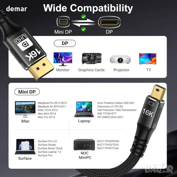 Този двупосочен кабел Mini DisplayPort 2.1 към DisplayPort 2.1 поддържа безпроблемно предаване между устройства Mini DP и DP. Той осигурява ултрависоки разделителни способности до 16K@60Hz, 8K@120Hz и 4K@240Hz с подобрен контраст и динамичен HDR. Предлагайки честотна лента от 80 Gbps, HBR3 и DSC 1.2a, той осигурява завладяващо игрово изживяване с 32-битово аудио и поддръжка на много екрани. Съвместим с широк набор от устройства Mini DP/Thunderbolt 2, той поддържа безупречно аудио преминаване за 7.1, 5.1 и 2.0 канали. Създаден за издръжливост, кабелът разполага с подсилена оплетка от найлон, позлатени конектори и калайдисано медно окабеляване за стабилно предаване и разсейване на топлината.