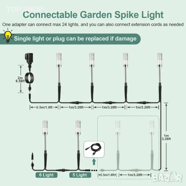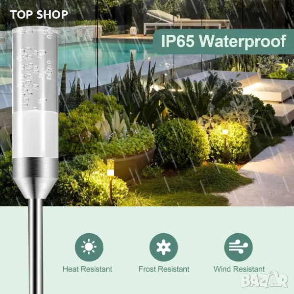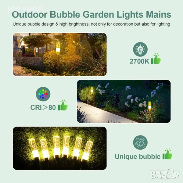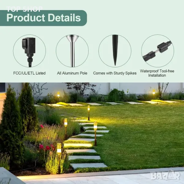 Тези външни градински светлини разполагат с висококачествени 5050 LED перли за лампи, осигуряващи ярка и стабилна 2700K топла бяла светлина с CRI>80 за подобрено осветление. Вграденият дизайн с малки балончета добавя декоративен щрих, като същевременно осигурява стабилно осветление. С разтегателен дизайн, до 24 лампи могат да бъдат свързани към един трансформатор, а удължителните кабели позволяват по-широка зона на покритие. Проектирани за издръжливост, те са водоустойчиви IP65 и могат да издържат на екстремни метеорологични условия, въпреки че адаптерът трябва да се поддържа сух. Работейки при безопасно 12V ниско напрежение, изцяло алуминиевият метален стълб подпомага разсейването на топлината, за да се предотврати прегряване. Инсталирането е напълно без инструменти, с прости ръчно затегнати конектори, позволяващи гъвкаво поставяне по протежение на алеи, пътеки и пейзажи.