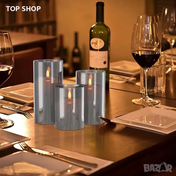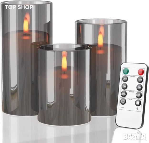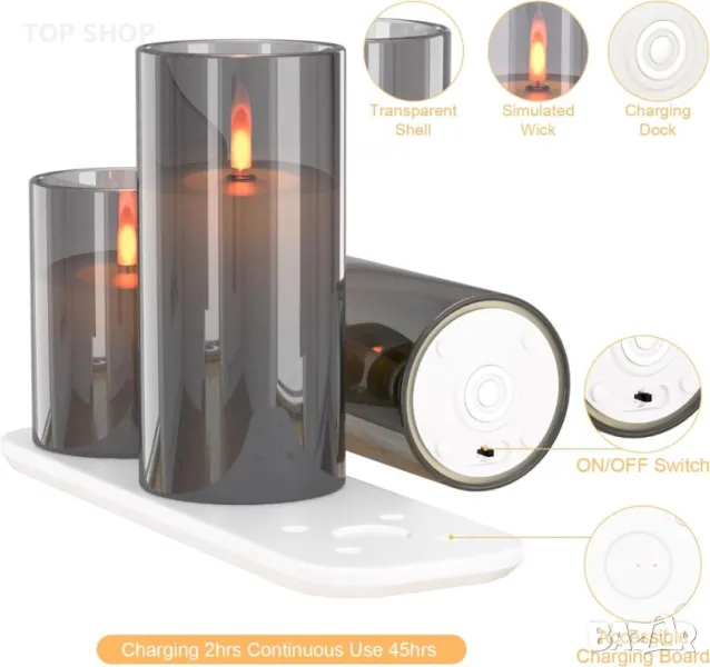 Този комплект включва три стъклени безпламъчни свещи (размери: Φ 7,6 см x В 10/12,7/15 см), платка за зареждане, дистанционно управление, ръководство за работа и кабел тип C. Свещите се зареждат за 2 часа и издържат над 45 часа. Отличаващи се с LED безпламъчни мигащи светлини, те осигуряват реалистичен пламък без дим, което ги прави безопасни за домашни любимци, деца и възрастни хора. Дистанционното с 10 клавиша позволява лесно управление, предлагайки ВКЛ./ИЗКЛ., таймери (2/4/6/8 часа), настройка на яркостта и опции за режим на осветление. Идеални за ежедневна декорация и различни поводи като фестивали, събития и домашна обстановка, тези свещи са екологични, без мирис и без восъчни капки, като използват усъвършенствана технология за зареждане.