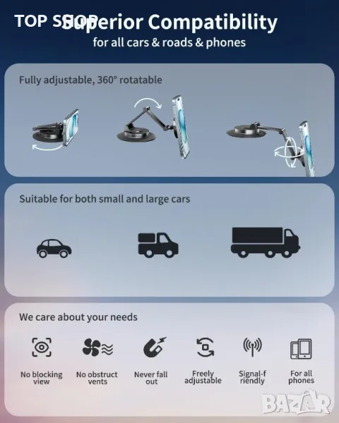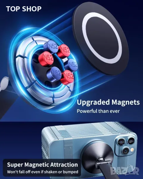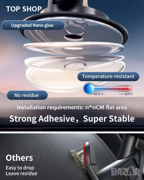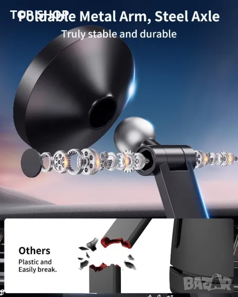 Този държач за телефон за кола е проектиран с мощно магнитно привличане, за да държи сигурно всички размери мобилни телефони, като гарантира, че те остават на място дори по неравни пътища. Той разполага с усъвършенствано 3M нано-силно лепило за изключителна температурна устойчивост и прилепване към различни арматурни табла, включително извити повърхности, без да оставя остатъци. Държачът се монтира и регулира лесно с една ръка, благодарение на регулируемата си основа, магнитна глава и телескопично рамо. Изработен от здрав метал, той осигурява оптимална производителност и стабилност, намалявайки вибрациите за по-плавно каране. Висококачествени компоненти като прецизни шпиндели, лагери и винтове осигуряват дългосрочна издръжливост на държача, което го прави надежден аксесоар за ежедневна употреба.
