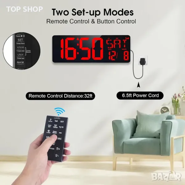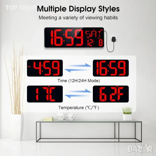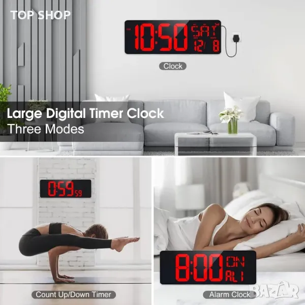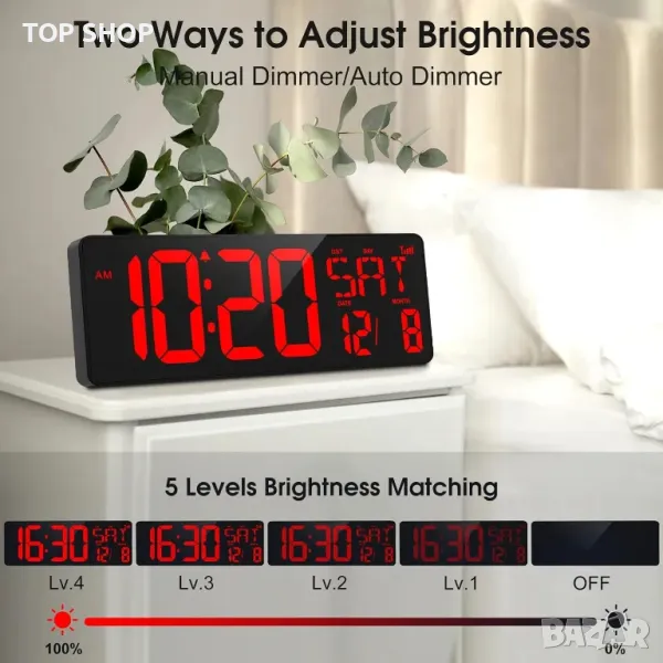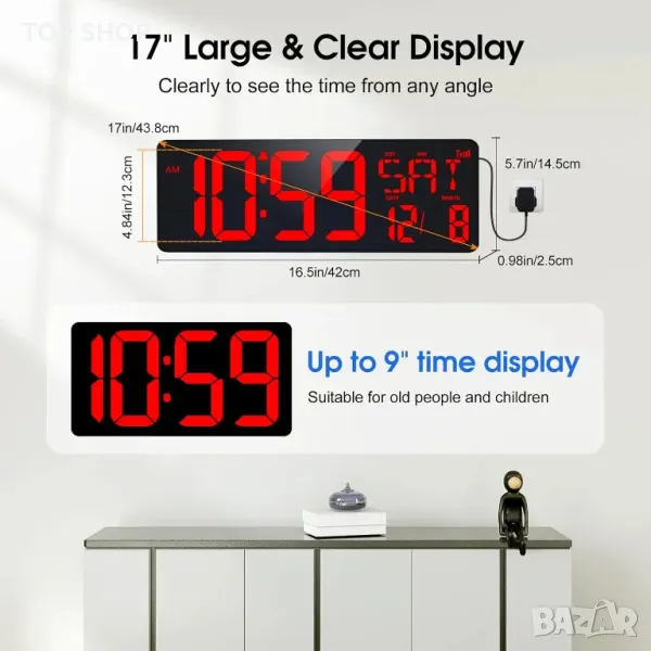 стенен часовник с Bluetooth елиминира неудобството от ръчни настройки на времето, като се синхронизира автоматично с вашия телефон за точно отчитане на времето. Отличаващ се със 17-инчов LED екран с висока разделителна способност с големи, ясни цифри за лесна четливост от разстояние, той включва функция за автоматично затъмняване за удобно гледане при различни условия на осветеност, с опция за изключване на дисплея за използване през нощта. Този мултифункционален часовник служи като таймер, аларма и часовник, което го прави универсален за различни настройки като домове, офиси и фитнес зали. Той предлага обхват на таймера за обратно/намаляване от 0-29 часа, заедно с 90-секундно предупреждение, когато обратното броене приключи. Захранван от адаптер с щепсел, той също така включва батерии за запазване на времето и настройките на алармата.