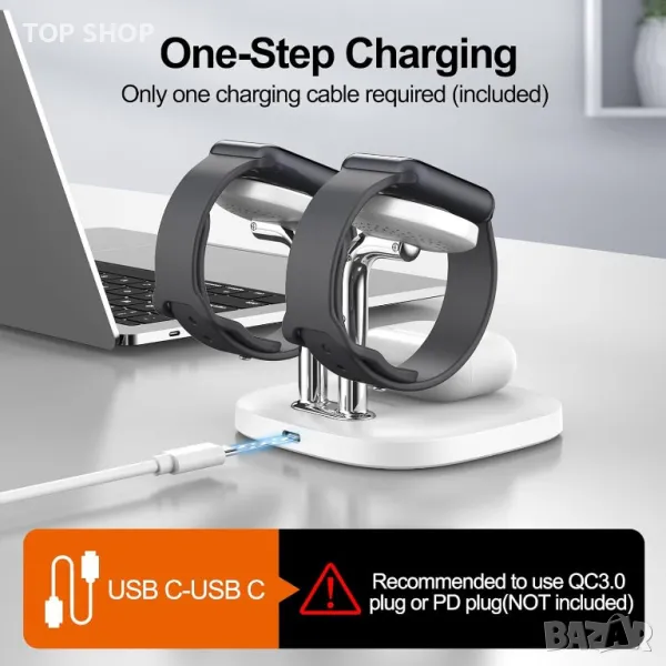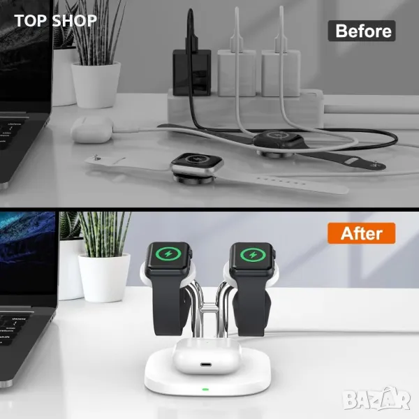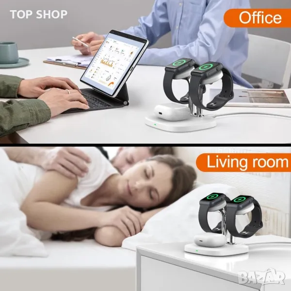 **Ключови думи:** 3 в 1 станция за безжично зареждане, Apple Watch, AirPods Pro, безжично зареждане, зарядно устройство, стойка за часовник, нощен режим, безжично зареждане на часовник и слушалки.