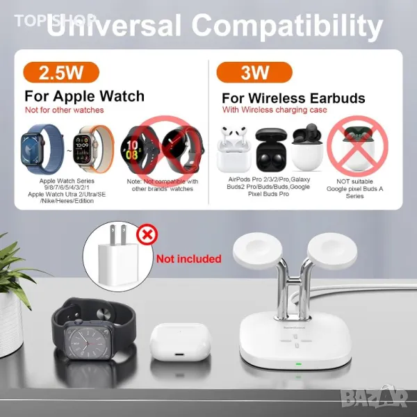 - Съвместимост с Apple Watch Ultra 2, SE, AirPods Pro и други безжично зареждани устройства