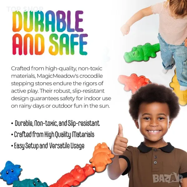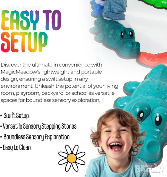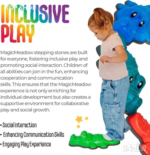 Крокодилските стъпала на MagicMeadow са експертно проектирани, за да обогатят сетивната ангажираност, с текстурирана повърхност за тактилна стимулация и живи, визуално привлекателни цветове, оформени като крокодили. Тези стъпала насърчават приобщаващата игра, приспособявайки деца с всякакви способности и насърчавайки социалното взаимодействие, комуникация и сътрудничество. Изработени са от издръжливи, нетоксични материали, осигуряващи безопасност и изживяване срещу приплъзване, независимо дали се използват на закрито или на открито. Лекият, преносим дизайн позволява лесна настройка и многостранна употреба в различни среди. В допълнение, тези стъпала служат за образователни цели, като подобряват двигателните умения, координацията и баланса, като същевременно насърчават въображаемата игра. MagicMeadow е доверена компания, базирана в Обединеното кралство, ангажирана с предоставянето на висококачествени сензорни играчки.
