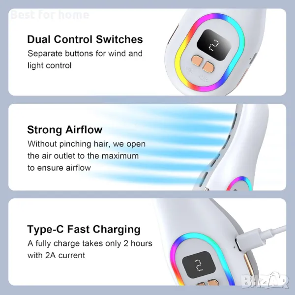 【Бързо зареждане тип C】 С порт за бързо зареждане и отнема само 2 часа за пълно зареждане (с 2 A ток на зареждане). Вентилатор за врата без остриета, не се притеснявайте, че косата или брадата ви ще се закачат за остриетата на вентилатора, възрастните хора и децата са много безопасни за използване.