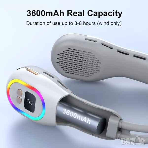 【Голям капацитет от 3600 mAh】 Акумулаторен вентилатор за врата с 3600 mAh батерия с голям реален капацитет осигурява 3-8 работни часа (реални измерени данни, само време за използване на вятъра, времето ще бъде съкратено, ако светлините са включени).