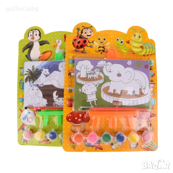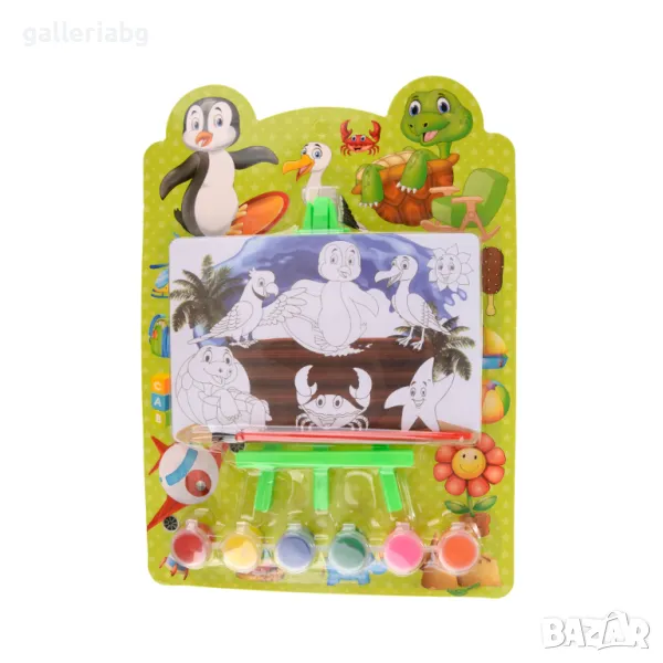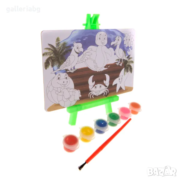 Комплект за оцветяване. Включва 6 броя темперни боички, картинка, четка и поставка за картината.