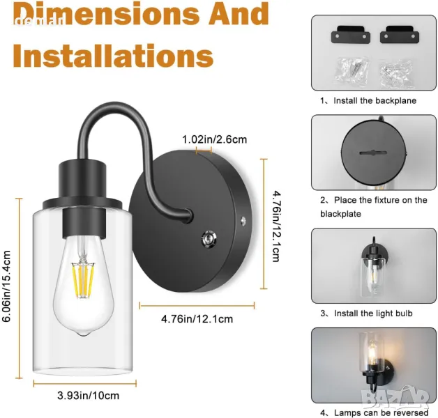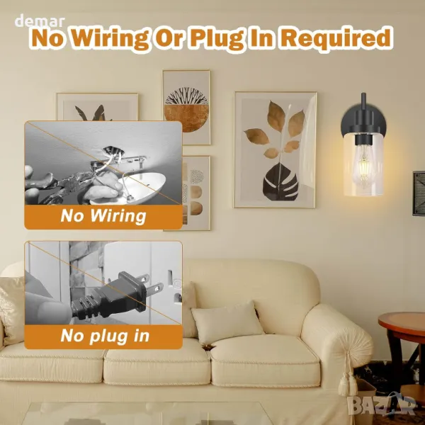 TZHILAN Димируем стенен аплик с батерии, комплект от 2 броя, черни, с крушки и дистанционно
