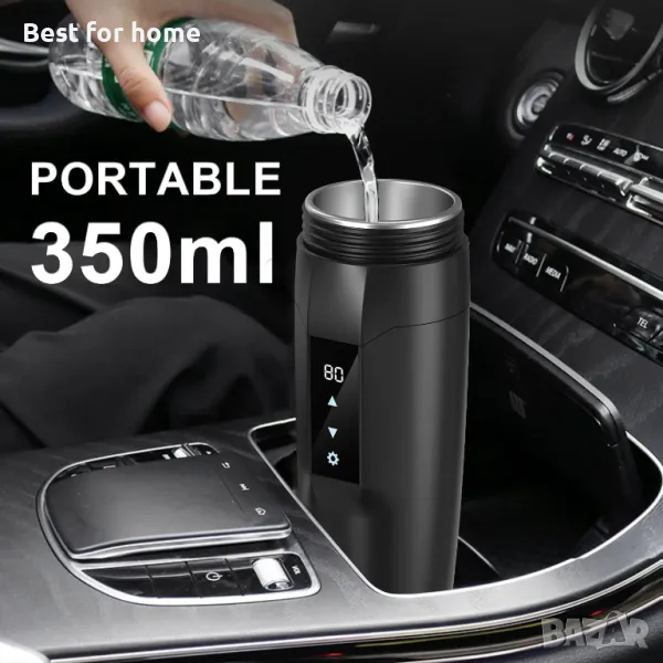 Преносима чаша за отопление, електрическа кана за пътуване 350 ml, чаша с подгряване за кола от неръждаема стомана 304, регулируема на 40 ~ 100 ℃, 12 V 80 W бутилка за бързо кипене, устойчива на течове, защита от сухо изгаряне.