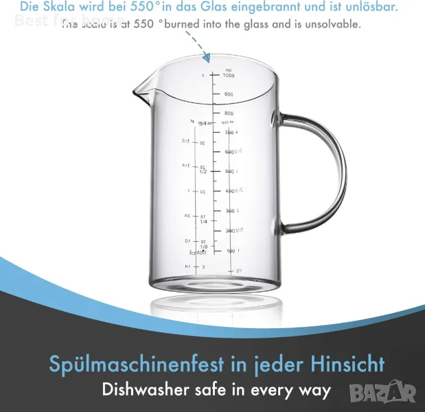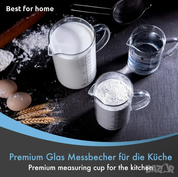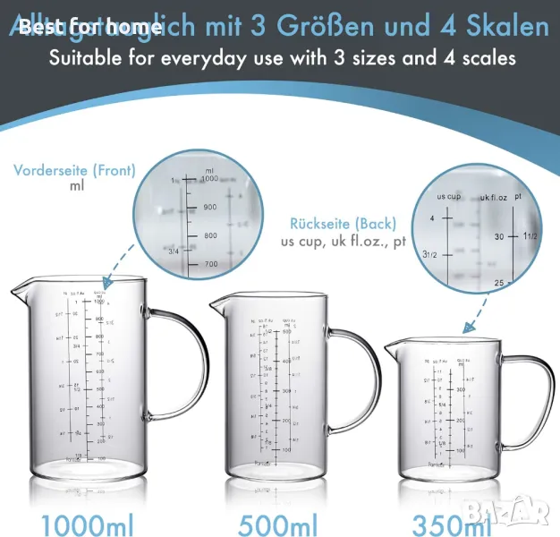 Три първокласни мерителни чаши – В този комплект ще получите три изключително издръжливи стъклени мерителни чаши с вместимост 1000 ml, 500 ml и 350 ml и с 4 популярни скали: ml, чаша за САЩ, fl.oz. за Великобритания, pt.