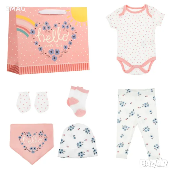 Бебешки комплект за новородено момиче, изработен от памук. Комплектът включва тениска с къс ръкав в цвят екрю с розови точки и копче в долната част, бял панталон със сини цветя и отворени крачоли, бяла шапка със сини цветя, розов лигавник бандана със сини цветя и щампа Hello Little One, бели ръкавици с ръкавици на розови точки и бели чорапи с розови детайли. Всичко идва на закачалка с бяла торбичка за дрехи и розова хартиена подаръчна торбичка с дръжки от бяла панделка (30,5x10x25,5 cm).