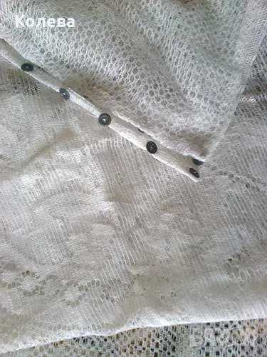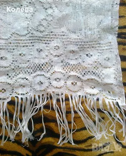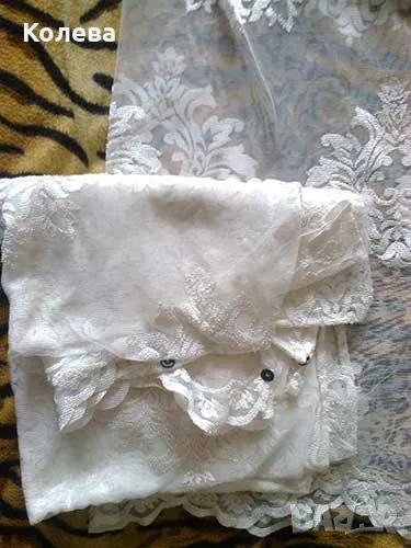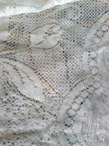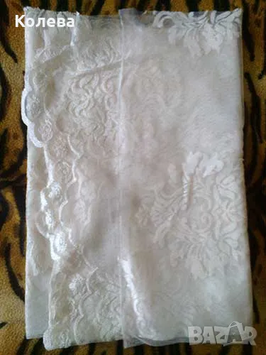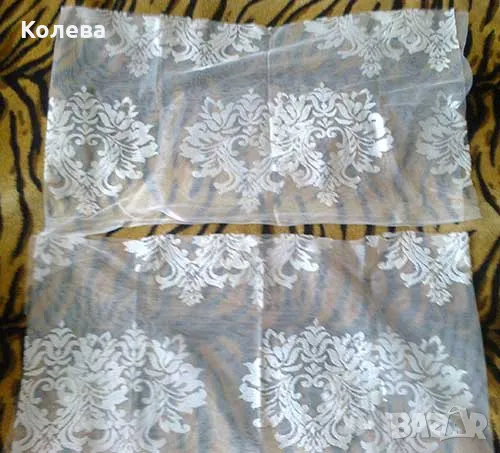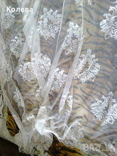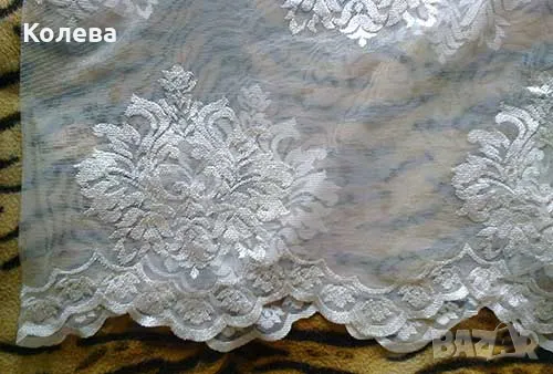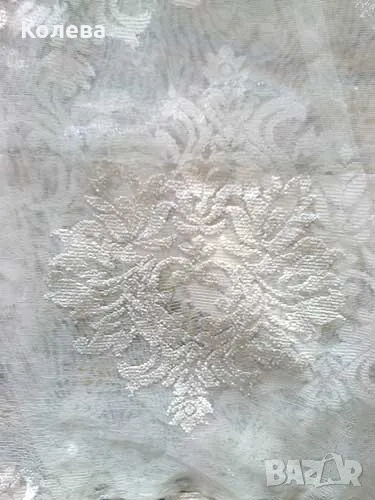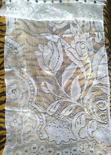 3. Пердета тюл с машинна бродерия – 2 броя. Долният край е със заобляния. Ширина – 1,20 м, дължина – 2, 30 м. Горе с копчета за закачане на старите метални корнизи с канал. Цена 40 лв. / 20,45 евро