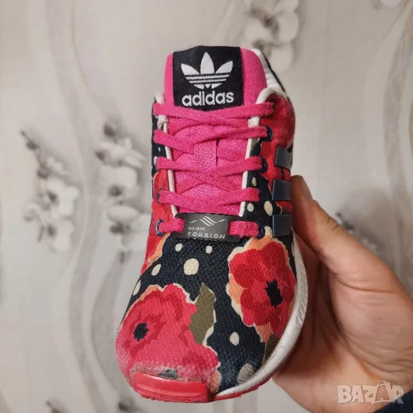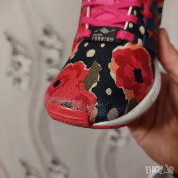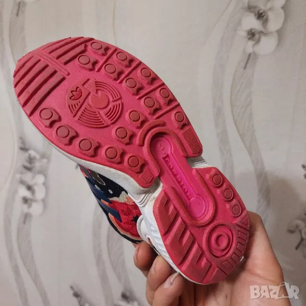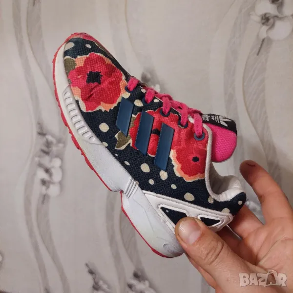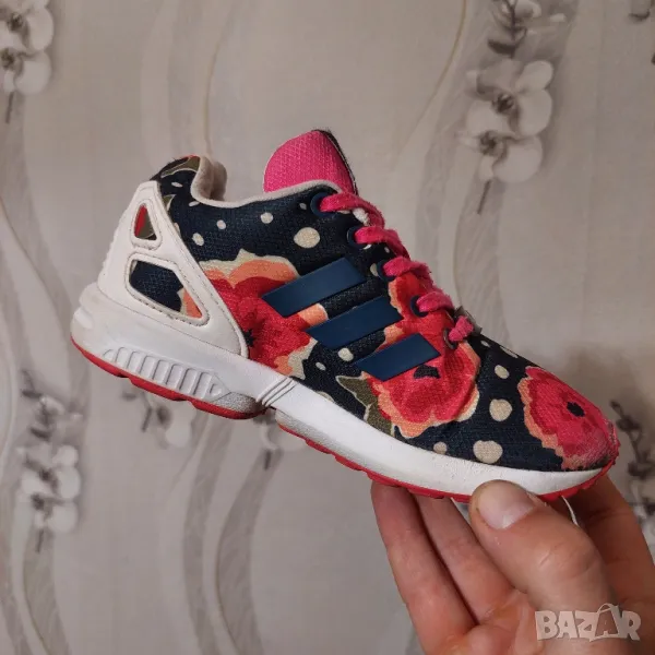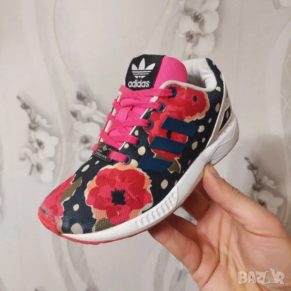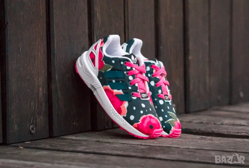 Елегантните детски обувки adidas ZX Flux, вдъхновени от модела за бягане ZX 8000, имат горна част с флорален принт с бели елементи и розова подметка. Обувките имат EVA пяна в междинната подметка за леко омекотяване.