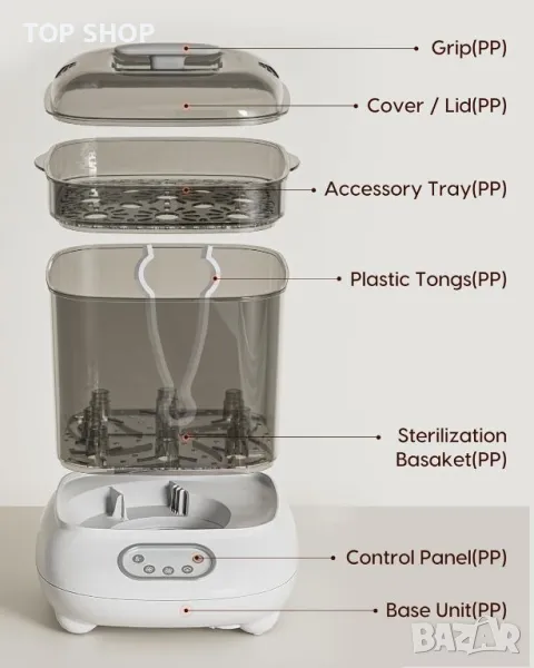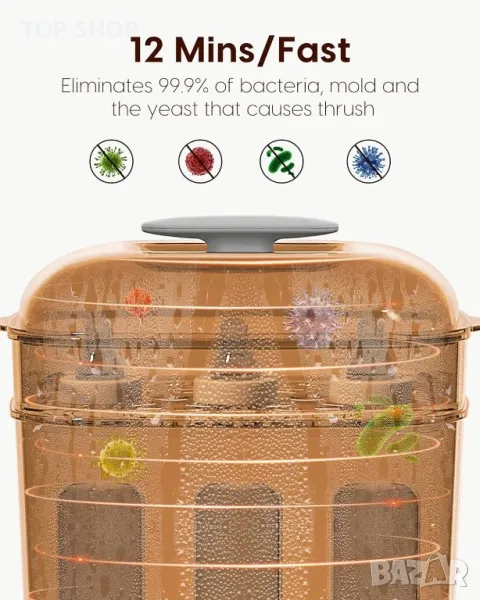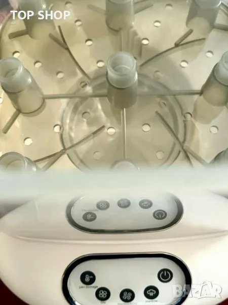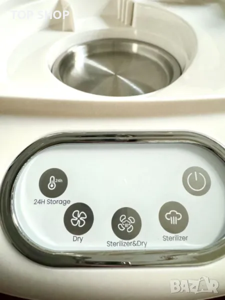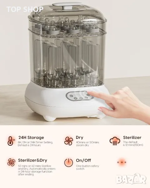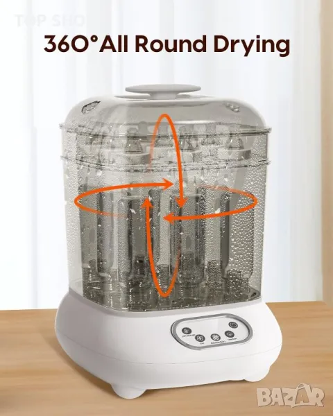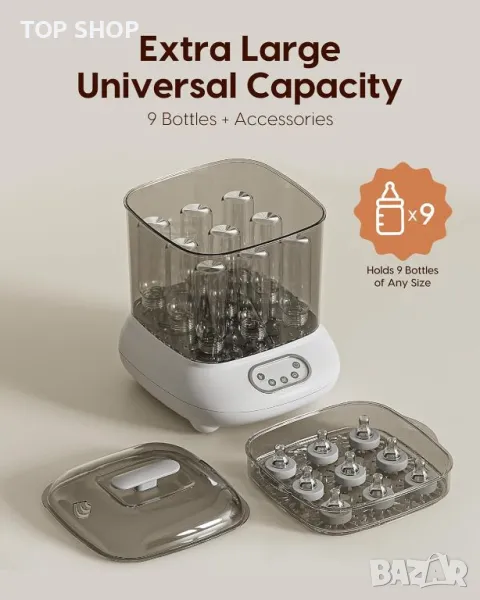 стерилизатор и сушилня "всичко в едно" ефективно стерилизира и изсушава до 9 бутилки и аксесоари като части за помпа за кърма и залъгалки с помощта на 100 С естествена пара, елиминирайки 99,99% от микробите. Универсалният модул разполага с регулируеми настройки за стерилизация, сушене и съхранение, запазвайки предметите стерилни до 24 часа. Той може да се похвали с голям капацитет, удобен за потребителя сензорен LCD контролен панел и безопасен дизайн на разделена структура. Освен това не съдържа BPA, което го прави надежден избор за гарантиране, че аксесоарите на вашето бебе са хигиенични.