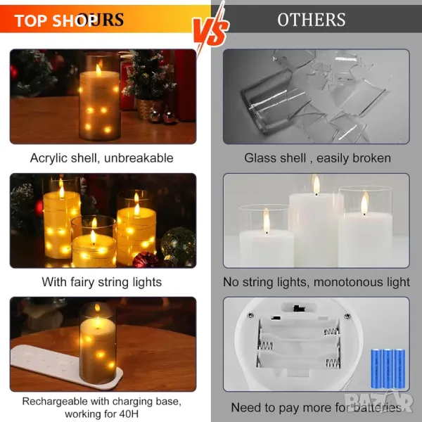 Тези LED свещи се предлагат в три височини (4"/5"/6") и разполагат с деликатни вградени светлинни нишки, създаващи блясък като звезда за романтична и уютна атмосфера, идеална за специални поводи. Всяка свещ има 500mAh акумулаторна батерия, с база за зареждане за едновременно презареждане, предлагаща дълготрайна, екологична употреба Изработени от безопасна, безпламъчна пластмаса с устойчива на разбиване акрилна обвивка, те са идеални за домове с деца и домашни любимци отделно управление на светлинни струни, настройка на яркостта и таймери за настройка (2/4/6/8 часа) С реалистичен 3D дизайн на фитила, тези свещи са идеални за декорации и подаръци.