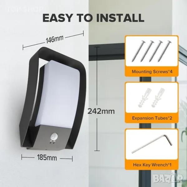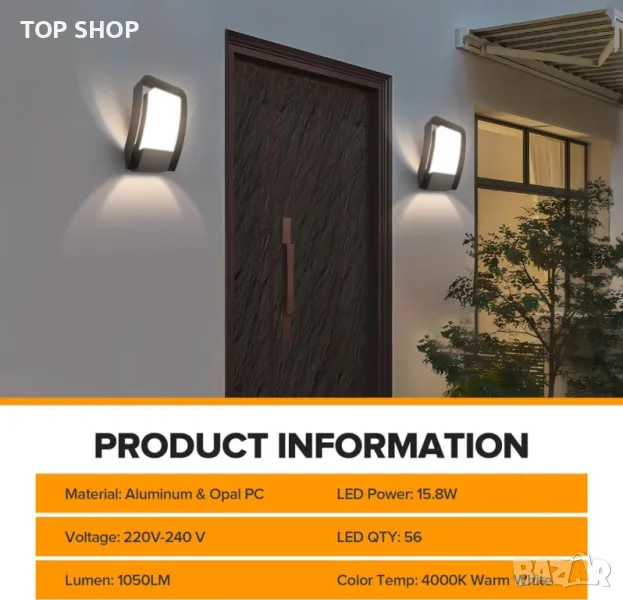 Този елегантен стенен аплик за открито се отличава с модерен дизайн, който допълва всеки декор, идеален за различни настройки, включително стени, беседки и вътрешни дворове. Той предлага ефективно осветление с мощност от 1050 LM и температура на топло бяло от 4000 K, като същевременно консумира само 15,8 W. Изработен от издръжлив алуминий с анти-UV капак от PC, той издържа 5000 часа тестове със солен спрей без ръжда и може да се похвали с IP54 водоустойчив рейтинг, гарантиращ дълготрайност и производителност както на закрито, така и на открито.