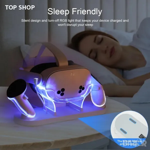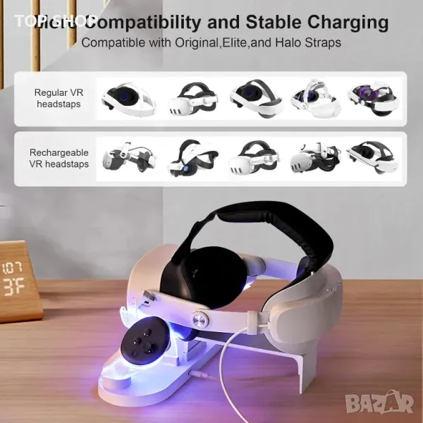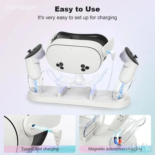 Тази докинг станция за зареждане предлага бързо зареждане, пълно захранване на контролерите за 2 часа и слушалките за 3 часа с помощта на оригиналния адаптер. Интелигентният му дизайн включва динамични RGB LED индикатори за състояние на зареждане и магнитен конектор, който защитава USB-C порта. Съвместим с различни стилове VR каишки за глава, той автоматично се настройва към различни тегла и работи със слушалки Quest 3 и Quest 3S. Екологичният дизайн включва две акумулаторни батерии от 600 mAh с над 500 цикъла на зареждане, намаляващи отпадъците. Включва докинг станция за зареждане, акумулаторни батерии, капаци за батерии, захранващ кабел Type-C и ръководство за потребителя с противоплъзгаща основа за стабилност и организация.