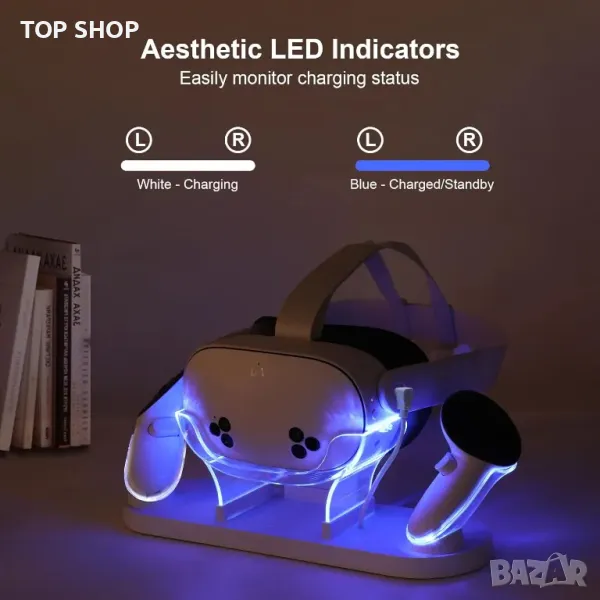 Докинг станция за зареждане за MetaQuest 3S/Quest 3, с LED индикатор, за VR конзола и контролер, бял