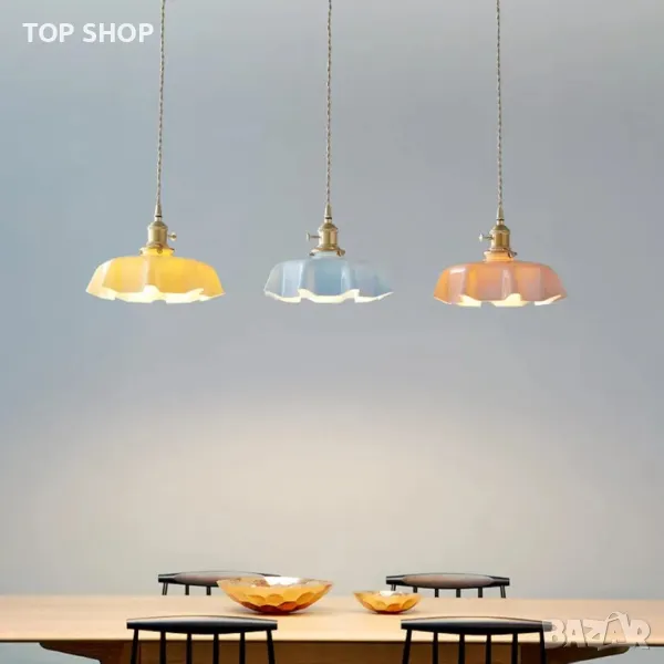 NICRX 250 mm стъклена висяща лампа с жълто цвете, висяща лампа от златен месинг и стъкло