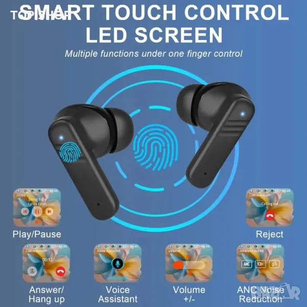 Безжични слушалки, интелигентен сензорен екран, Bluetooth 5.4, ANC/ENC, HiFi стерео, IPX5, черни