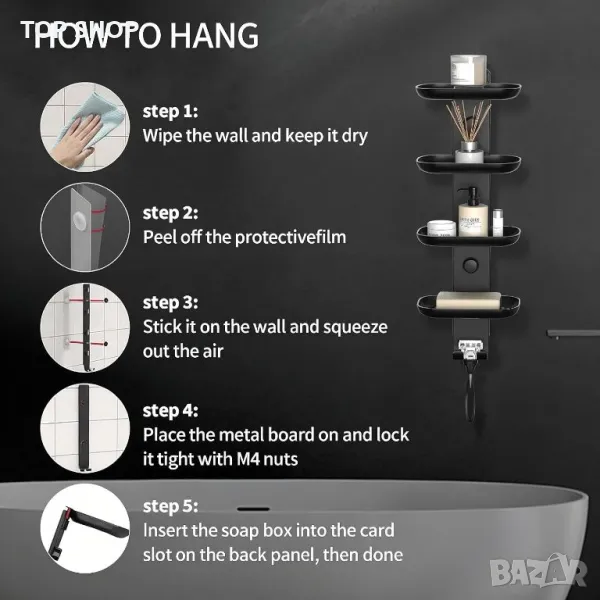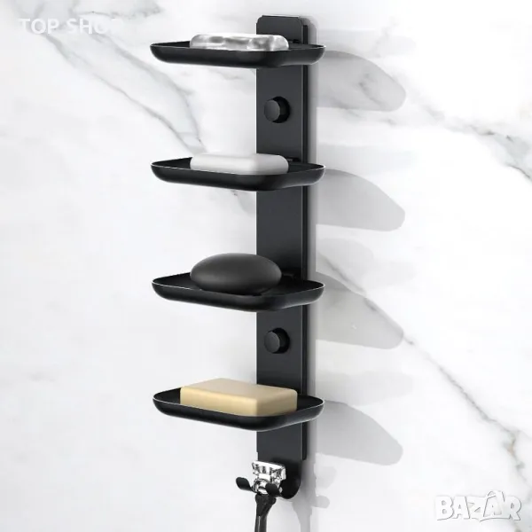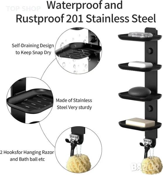Държачът за сапун за шампоан е изработен от матова черна неръждаема стомана, което гарантира, че е устойчив на ръжда, влага, здрав и издръжлив, идеален за влажни среди като бани и кухни. Неговият 4-степенен дизайн осигурява достатъчно място за различни блокчета сапун, като шампоан, балсам, блокчета сапун за лице и тяло, докато долната кука може да закача кърпи, топки за баня, бръсначи и други артикули, спестявайки място ефективно. Самоотцеждащият се дизайн поддържа сапунените пръчици сухи, предотвратявайки слузестите остатъци и удължавайки живота на сапуна, за да намали загубата. Лесен за инсталиране без необходими инструменти или пробиване, той е подходящ за гладки повърхности като керамични плочки, стъкло и мрамор. Сапунерката за пътуване е с размери 5,3"Ш x 4"Д x 14,5"В и включва 4-степенна поставка за сапун с кукички и ръководство за потребителя, което я прави идеално допълнение към всяка баня.