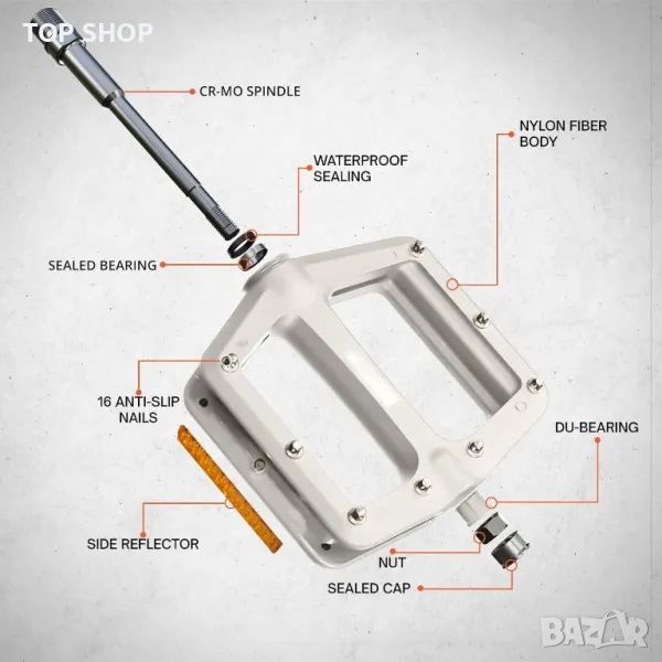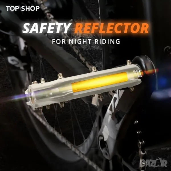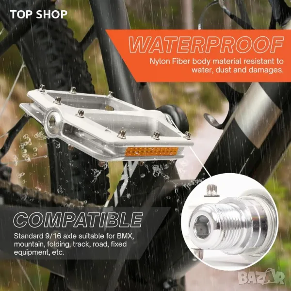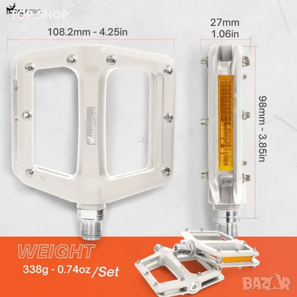педали за велосипеди с висока видимост са проектирани за безопасност и видимост при условия на слаба светлина, включващи здрави, но леки тела от найлонови влакна и отразяващи страни. Всеки педал тежи 180 g и включва високоскоростни запечатани лагери за намалено триене и подобрена ефективност при въртене на педалите. Педалите предлагат отлично сцепление с 8 неплъзгащи се щифта от неръждаема стомана от всяка страна и отворен дизайн, който предотвратява натрупването на кал. Те са водоустойчиви, устойчиви на износване и корозия и имат широка платформа (98 mm x 108 mm, дебелина 20 mm) за повишена стабилност и комфорт. Съвместими със стандартна 9/16-инчова ос, тези педали са лесни за инсталиране и подходящи за различни велосипеди, включително MTB, шосейни велосипеди, BMX, електрически велосипеди и градски велосипеди. (L отляво и R отдясно)