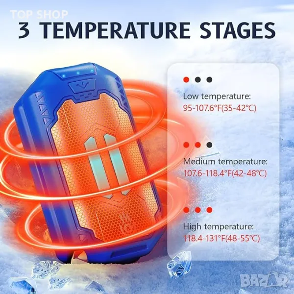Този артикул включва ултра леки, ултра тънки нагреватели за ръце за многократна употреба със страхотен дизайн, вдъхновен от механиката, изработен от чист вносен алуминий и огнеустойчив ABS. Всеки нагревател за ръце тежи само 73 g, което го прави изключително преносим и лесен за поставяне в джобове или ръкавици. Предлага три степени на нагряване с двустранно нагряване, постигайки максимална температура от 131°F/55°C. Етапите включват ниски (4045°C), средни (4550°C) и високи (50~55°C) температури, осигуряващи прецизно и стабилно нагряване. С капацитет от 3000 mAh, комплектът от 2 комплекта служи като нагревател и зарядно устройство, осигурявайки 4-8 часа топлина, идеален за работа на открито, ежедневни разходки и зимни дейности. Той е универсален за различни поводи като футболни игри, събития на открито и дейности в студено време като риболов, туризъм, къмпинг и каране на ски. Тази стилна и практична грейка за ръце е перфектен топъл подарък за близки, предлагайки едновременно топлина и модерен щрих.