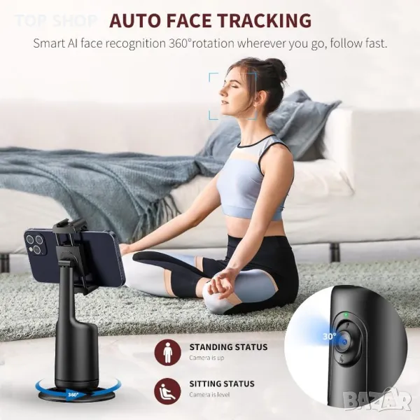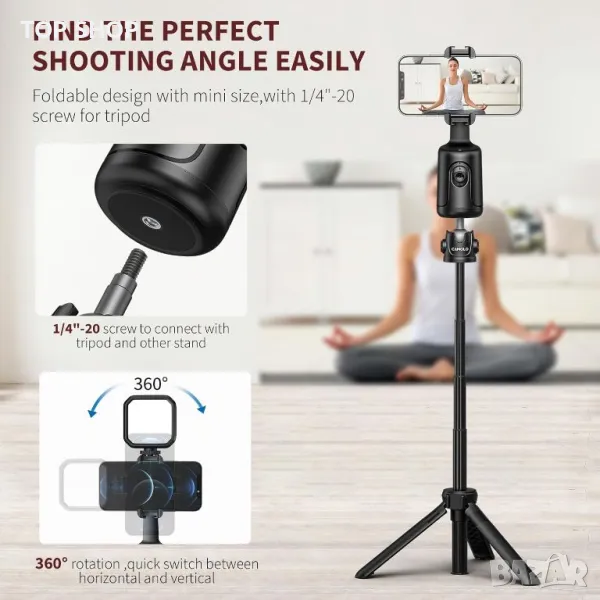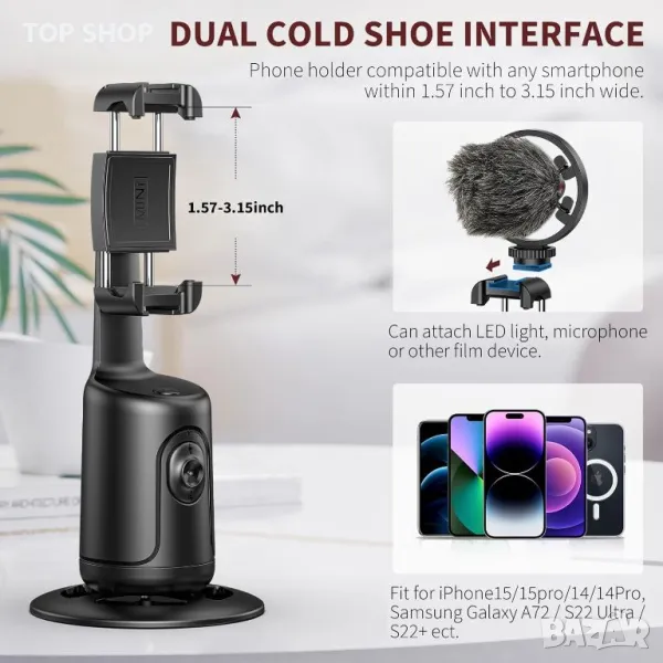 Този 360° държач за телефон с интелигентно проследяване на лицево разпознаване включва AI система, която проследява лицето или тялото ви, върти се на 360° с вашето движение и включва Bluetooth дистанционно управление за удобно снимане. Работи без приложение, защитавайки поверителността ви и е съвместимо с всички видео приложения. Държачът включва двойни студени обувки за допълнителни устройства, въртящи се на 360° и регулируеми ъгли и управление с жестове за лесна работа. Има стандартен 1/4" интерфейс за монтиране на статив, пасва на различни размери телефони и включва акумулаторна батерия, издържаща 4-8 часа с USB зареждане.