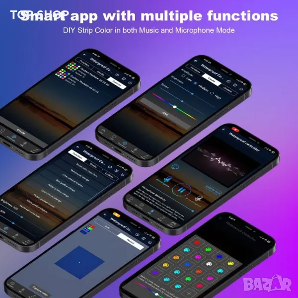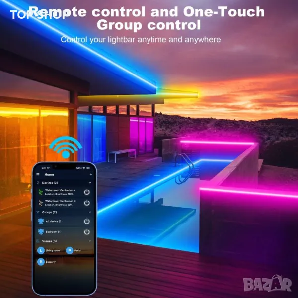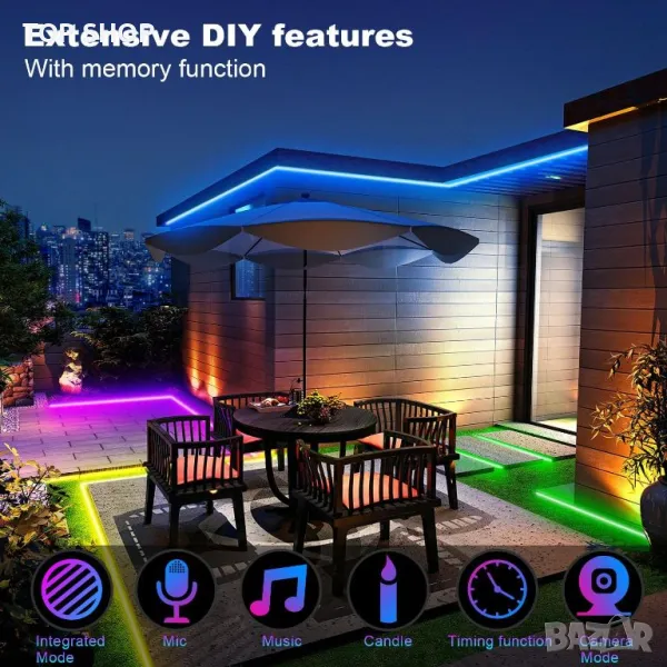 Външната осветителна лента 15M IP67 е RGB лента с една ролка, която опростява монтажа и е водоустойчива, което я прави идеална за различни вътрешни и външни настройки като спални, подсветки на телевизори, басейни, балкони и павилиони. Той разполага с многофункционално приложение "Surplife" и 2.4G RF дистанционно управление за работа на 360°, предлагащо синхронизиране на музика, режим на микрофон, опции "Направи си сам" и мини игра за избор на цвят. Съвместим с Alexa и Google Assistant, той поддържа интелигентен гласов контрол и автоматизирани задачи чрез приложението IFTTT, с Wi-Fi контрол, достъпен отвсякъде. Интелигентният таймер и функцията за памет подобряват удобството, като запомнят предишни настройки. Инсталирането става лесно със самозалепващ се гръб, скоби и винтове и гъвкав захранващ кабел 1M. LED лентата е с ширина 10 мм.