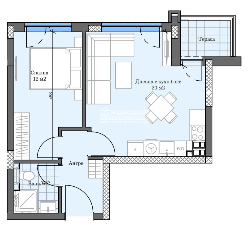 Оферта 66570: Предлагаме Ви възможността да закупите 2-стаен апартамент в новоизграждащ се луксозен жилищен комплекс с модерна визия, проектиран да създаде максимален комфорт на живущите в него. Tри хоризонтално разположени жилищни секции с елегантен силует готов да предложи комфорт и модерен начин на живот.Едно от основните му предимства е страхотната локация, отлична комуникативност и динамична пътна инфраструктура, която осигурява бърз и лесен достъп до комплекса, от всяка точка на града. Той съчетава лукс, спокойствие и комфорт, с подсигурени паркоместа и гаражи. Жилището се състои от дневна с кухненска част, спалня, баня с тоалетна, тераса и прилежащо избено помещение. Основната концепция при проектирането е да се постигнат просторни и функционални стаи, с цел да се създаде максимален уют на модерното семейство. Изключителна съвременна архитектура и модерна технология на строителство. Визията е иновативна, привличаща внимание с уникалността си. Всяко жилище ще разполага с пълно окабеляване за домофон, интернет и кабелна телевизия, общите части са луксозно завършени, жилищата са с алуминиева дограма с троен стъклопакет от най-висок клас, масивна блиндирана входна врата. За удобство на живущите съществува възможността да закупят подземни паркоместа и гаражи с топла връзка към комплекса. Гъвкави схеми на разсрочено плащане спрямо възможностите на клиента в рамките на строителството или закупуване чрез Банков Кредит, на изключително изгодни условия за клиенти на агенцията !!!ВИЖТЕ ОЩЕ ИЗГОДНИ ОФЕРТИ НА https://www.kondorimoti.com/ С ЕЖЕДНЕВНА АКТУАЛИЗАЦИЯ!