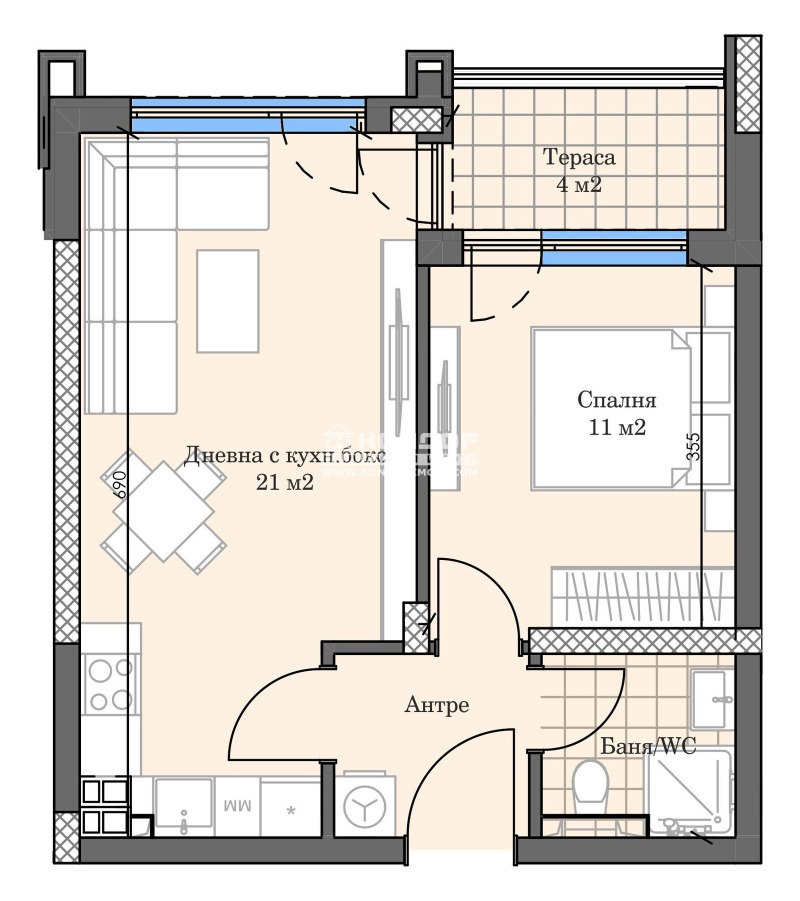 Оферта 66565: Предлагаме Ви възможността да закупите 2-стаен апартамент в новоизграждащ се луксозен жилищен комплекс с модерна визия, проектиран да създаде максимален комфорт на живущите в него. Tри хоризонтално разположени жилищни секции с елегантен силует готов да предложи комфорт и модерен начин на живот.Едно от основните му предимства е страхотната локация, отлична комуникативност и динамична пътна инфраструктура, която осигурява бърз и лесен достъп до комплекса, от всяка точка на града. Той съчетава лукс, спокойствие и комфорт, с подсигурени паркоместа и гаражи. Жилището се състои от дневна с кухненска част, спалня, баня с тоалетна, тераса и прилежащо избено помещение. Основната концепция при проектирането е да се постигнат просторни и функционални стаи, с цел да се създаде максимален уют на модерното семейство. Изключителна съвременна архитектура и модерна технология на строителство. Визията е иновативна, привличаща внимание с уникалността си. Всяко жилище ще разполага с пълно окабеляване за домофон, интернет и кабелна телевизия, общите части са луксозно завършени, жилищата са с алуминиева дограма с троен стъклопакет от най-висок клас, масивна блиндирана входна врата. За удобство на живущите съществува възможността да закупят подземни паркоместа и гаражи с топла връзка към комплекса. Гъвкави схеми на разсрочено плащане спрямо възможностите на клиента в рамките на строителството или закупуване чрез Банков Кредит, на изключително изгодни условия за клиенти на агенцията !!!ВИЖТЕ ОЩЕ ИЗГОДНИ ОФЕРТИ НА https://www.kondorimoti.com/ С ЕЖЕДНЕВНА АКТУАЛИЗАЦИЯ!