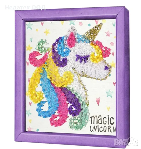 Създавайте уникални произведения на изкуството с конци. Създайте дизайна, който желаете, или включения шаблон на еднорог върху картона от пяна и поставете пластмасовите щифтове. Завържете предпочитания от вас конец към първия пирон и започнете да го прекарвате около гвоздеите в реда, в който са поставени.