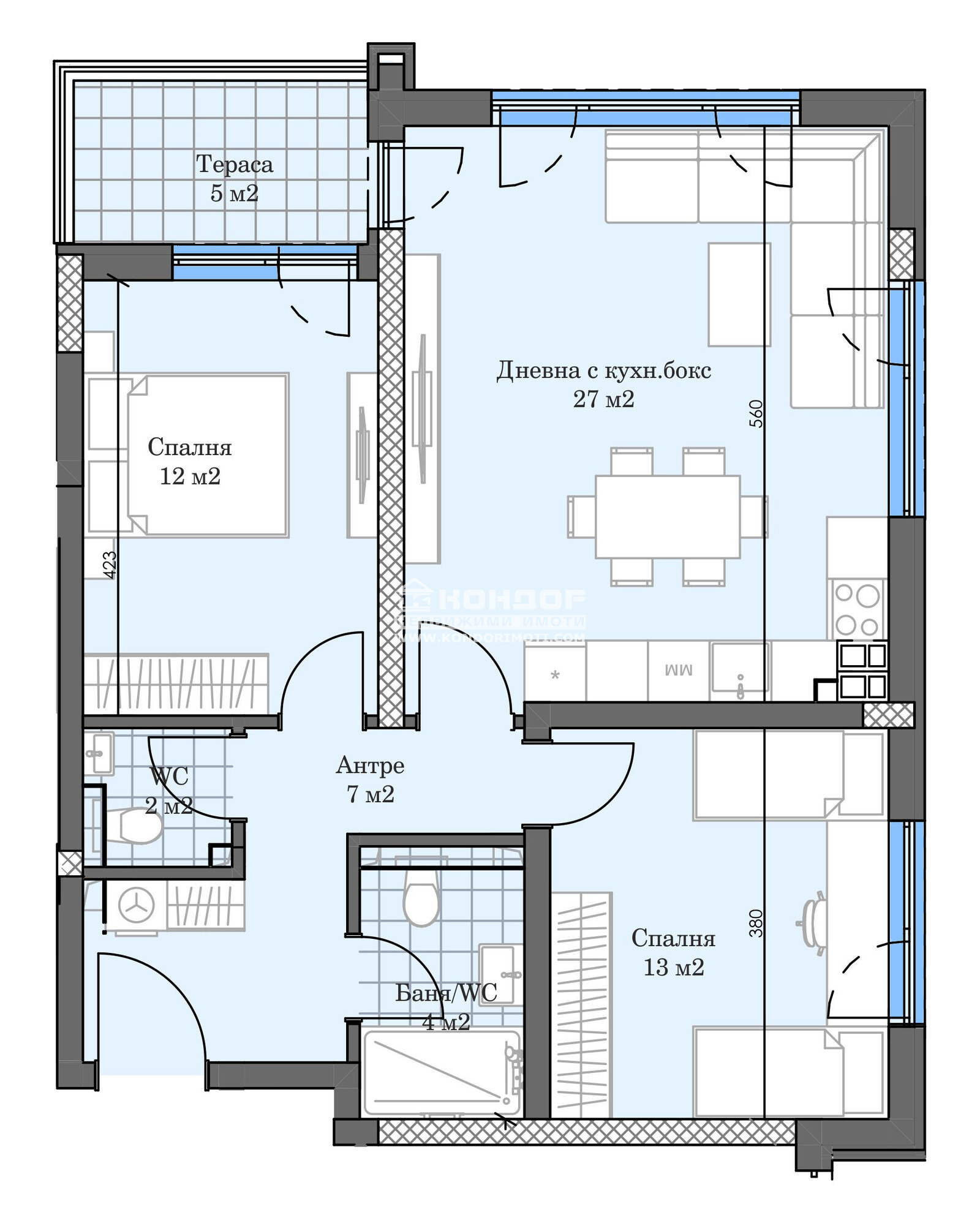 Оферта 66566: Предлагаме Ви възможността да закупите тристаен апартамент в новоизграждащ се луксозен жилищен комплекс с модерна визия, проектиран да създаде максимален комфорт на живущите в него. Tри хоризонтално разположени жилищни секции с елегантен силует готов да предложи комфорт и модерен начин на живот. Едно от основните му предимства е добрата локация, отлична комуникативност и динамична пътна инфраструктура, която осигурява бърз и лесен достъп до комплекса, от всяка точка на града. Той съчетава лукс, спокойствие и комфорт, с подсигурени паркоместа и гаражи. Жилището се състои от ъглова дневна 27 кв.м. с кухненска част и трапезария, две самостоятелни спални, баня с тоалетна, втора тоалетна, входно антре с място за гардероб и перално и една тераса. Основната концепция при проектирането е да се постигнат просторни и функционални стаи, с цел да се създаде максимален уют на модерното семейство. Изключителна съвременна архитектура и модерна технология на строителство. Визията е иновативна, привличаща внимание с уникалността си. Всяко жилище ще разполага с пълно окабеляване за домофон, интернет и кабелна телевизия, общите части са луксозно завършени, жилищата са с алуминиева дограма с троен стъклопакет от най-висок клас, масивна блиндирана входна врата. За удобство на живущите съществува възможността да закупят подземни паркоместа и гаражи с топла връзка към комплекса. Гъвкави схеми на разсрочено плащане спрямо възможностите на клиента в рамките на строителството или закупуване чрез Банков Кредит, на изключително изгодни условия за клиенти на агенцията!!! Приложените изображения са от завършени проекти на строителната фирма.ВИЖТЕ ОЩЕ ИЗГОДНИ ОФЕРТИ НА https://www.kondorimoti.com/ С ЕЖЕДНЕВНА АКТУАЛИЗАЦИЯ!