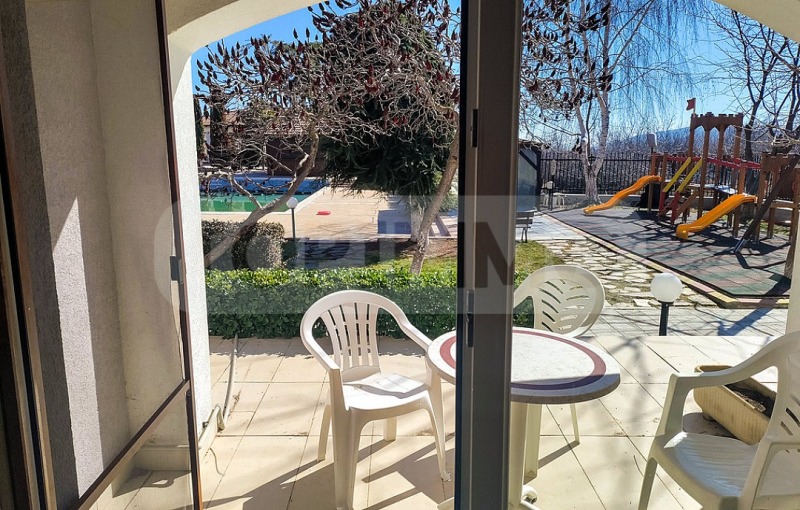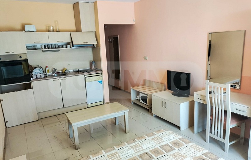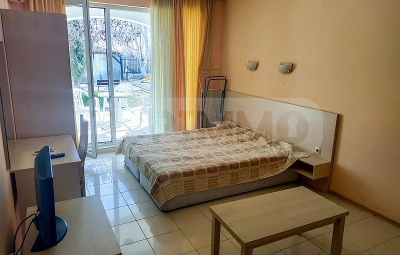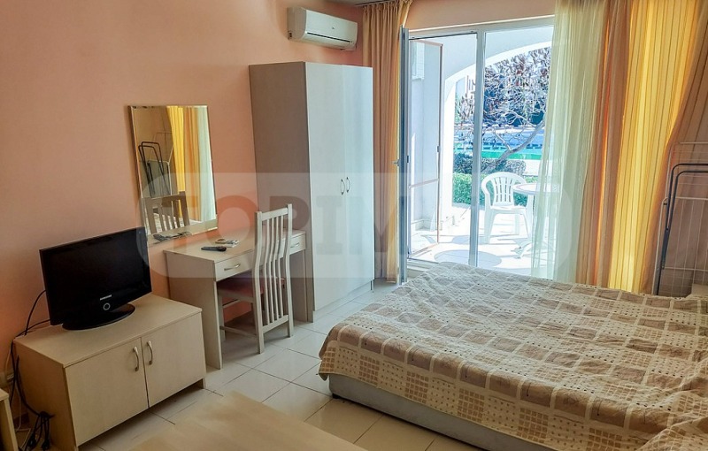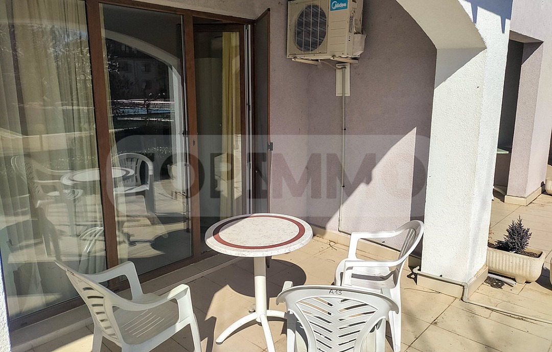 Апартаментът е напълно обзаведен и се състои от входно антре, тоалетна с душ кабина, обединени дневна и спалня с кухненски бокс. От апартамента има достъп до тераса, от която се открива гледка към градината и басейна.