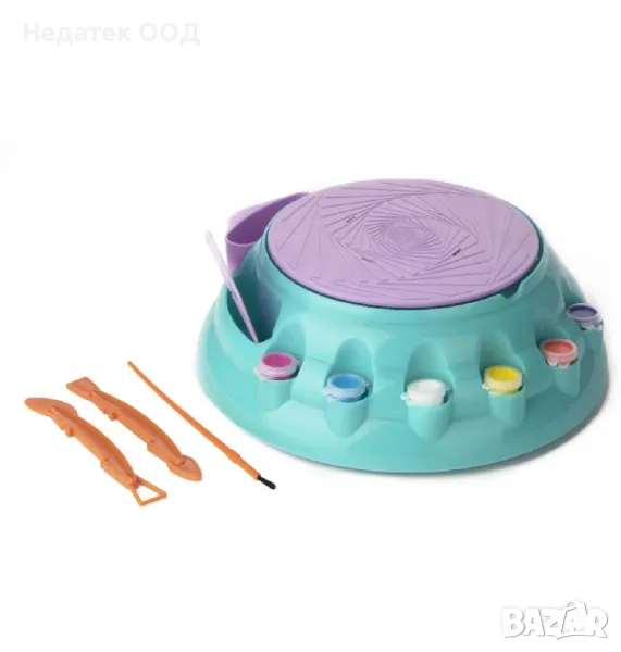 Грънчарско колело с инструмент за оформяне, за да придадете форма и цвят на вашите конструкции. Съдържа устройство за керамика, 2 инструмента за декориране, инструмент за шлайфане на ръбове, приставка за оформяне на керамика, стойка за инструменти, сушеща се на въздух глина, 6 саксии за боя, четка и лист с инструкции. Работи с 4 батерии 1.5V LR14 (не са включени).
