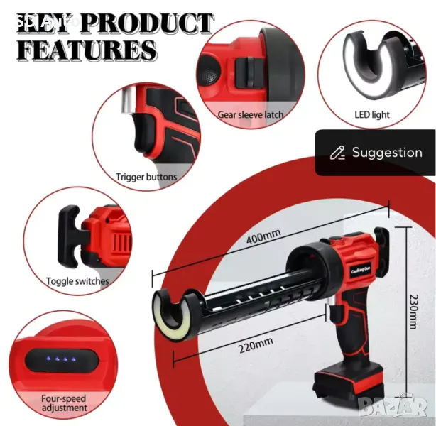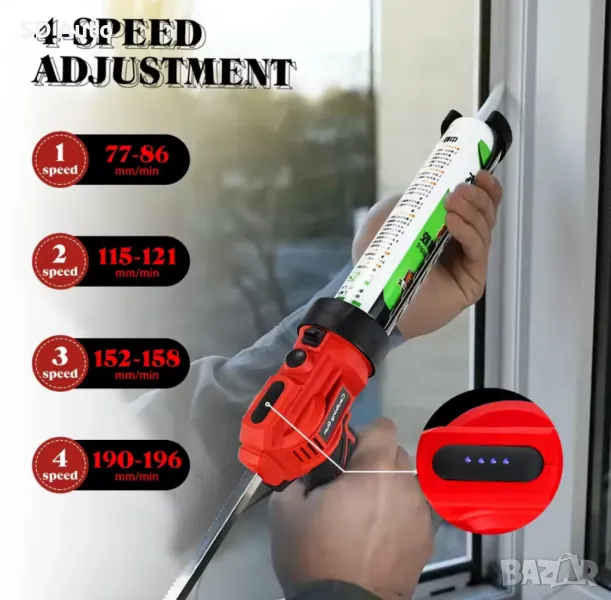 Регулируем с четири скорости: Пистолетът има четири диапазона на скоростта и скоростта на тягата може да се регулира между 0 и 196 милиметра в минута. Променливият тригер може също така да контролира скоростта на потока и да избере съответния дебит според различните нужди, което може по-добре да контролира скоростта на потока на лепилото.