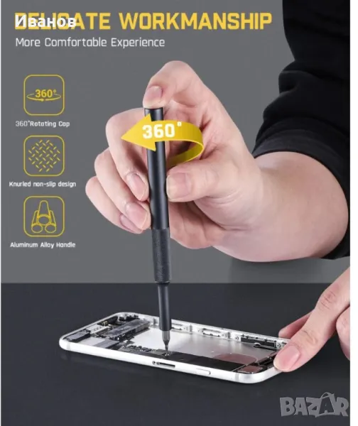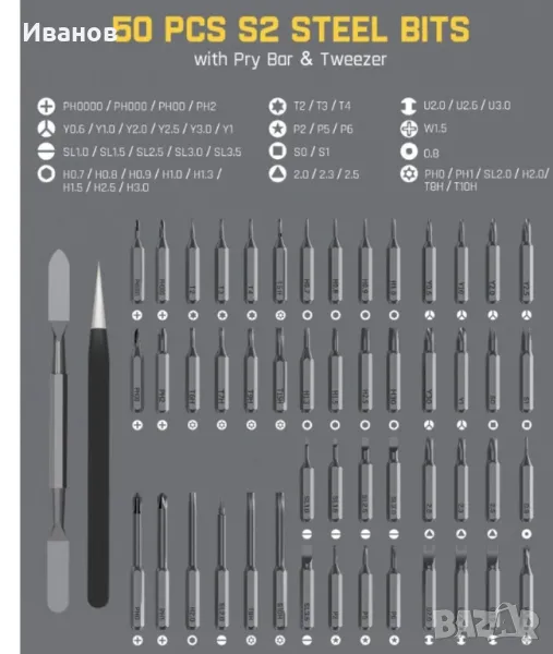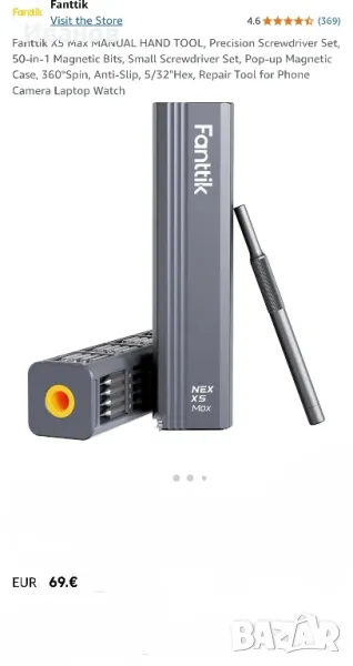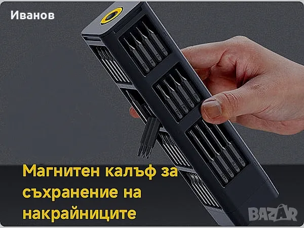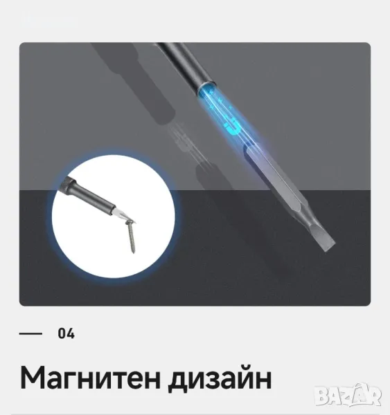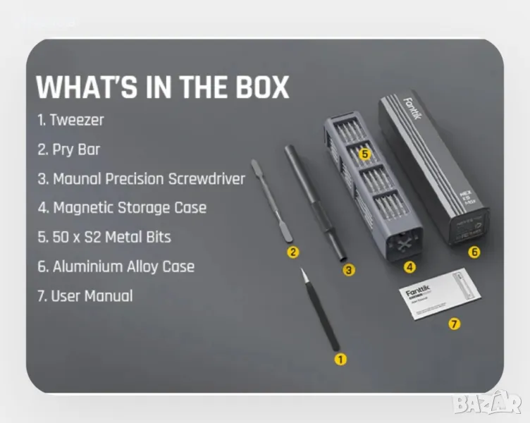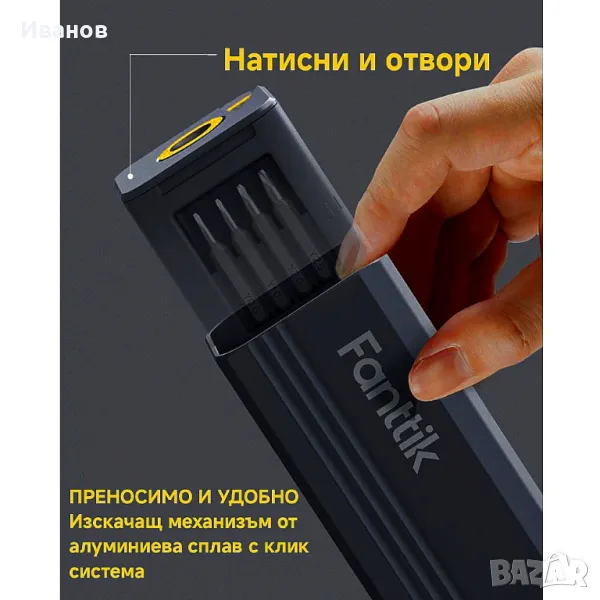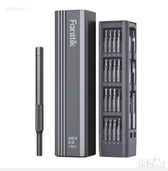 Метални битове 50 в 1Висококачествената Отвертката Fanttik X5 MAX съдържа 50 бита, 1 чифт пинсети и 1 щифт в 9 вида. Можете без усилие да се справяте с всички видове ежедневна поддръжка с този чист продукт. От Tors до Philips, плоски глави до hex, каквото и да е, X5 MAX покрива всичко. Увеличава вашата гъвкавост при DIY и поддръжка, като включва ремонт на суичове, лаптопи, мобилни телефони, камери, дронове и др.Първокласен магнитен калъфОпаковката има вграден бутон за изваждане, който изважда вътрешното съдържание с леко натискане. Корпусът е изработен от алуминиева сплав, обработена чрез аноксично оксидиране, което го прави устойчив на ръжда и корозия, и значително увеличава издръжливостта. В същото време неговата ергономична дръжка пасва на формата на ръката ви, което позволява по-удобно държане.Издръжлив, точен и безопасенГлавата на бита е изработена от легирана стомана S2 с твърдост до 60 HRC, която има по-дълъг живот и по-добра устойчивост на корозия. Този превъзходен материал гарантира, че главата на бита е прецизна и идеално монтирана към главата на винта. Пинцетите са екранирани с резистивно ESD покритие за предотвратяване на електростатично увреждане на електронните компоненти. Двата края на лоста имат плосък дизайн, което улеснява отварянето на елементите, които трябва да бъдат ремонтирани.