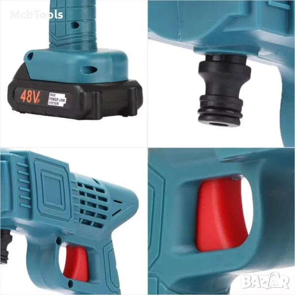 Мобилната машина за миене под налягане с батерия е високопроизводителна мобилна система за миене под налягане. Уредът, захранван с батерии, е универсален, като може да се трансформира само с няколко стъпки в мощно почистващо устройство, пръскачка за пяна, почистваща четка или пръскащо устройство за нанасяне на химически разтвори за растителна защита. Пералнята е независима от захранващ кабел и е винаги готова за използване, където е необходимо – в градината, около къщата, на следващата почивка на къмпинг или на планинско колоездене. Основният комплект включва почистващ уред, който е оборудван с 2 многофункционални дюзи и удължител, кабел за зареждане на батерията с връзка за кола, кутия за миещ разтвор, 36v батерия и дюза за свързване на маркуч. Работното налягане може да се регулира, така че е възможно както леко, така и силно почистване. Смукателният маркуч изтегля течност от всякакъв източник, независимо дали е кофа, езеро или кран. Благодарение на включения адаптер за PET бутилка, водата може да се използва от всяка пластмасова бутилка.