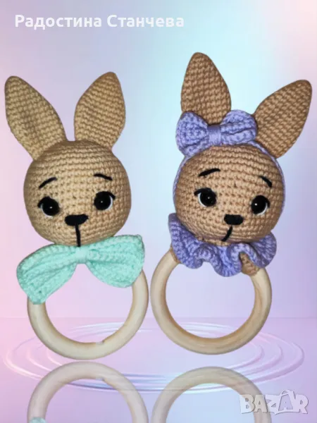 Изработени с внимание към детайла с прежда памук/акрил 🧶, безопасни очички 👀, силиконов пух 💭, дървен ринг за дрънкалките ииии много любов разбира се. Зайковците са високи около 30см с ушичките.
