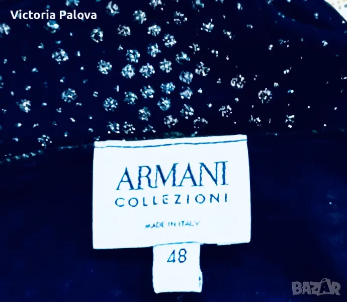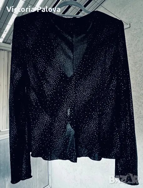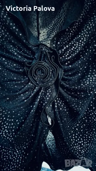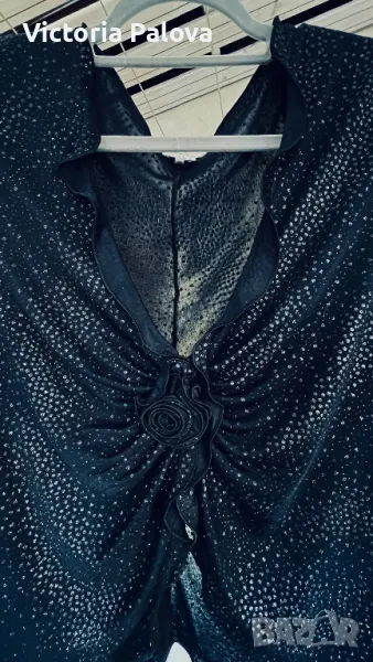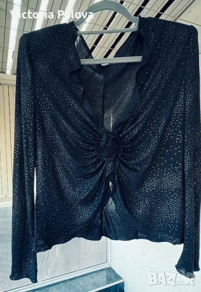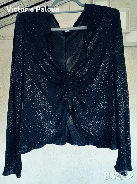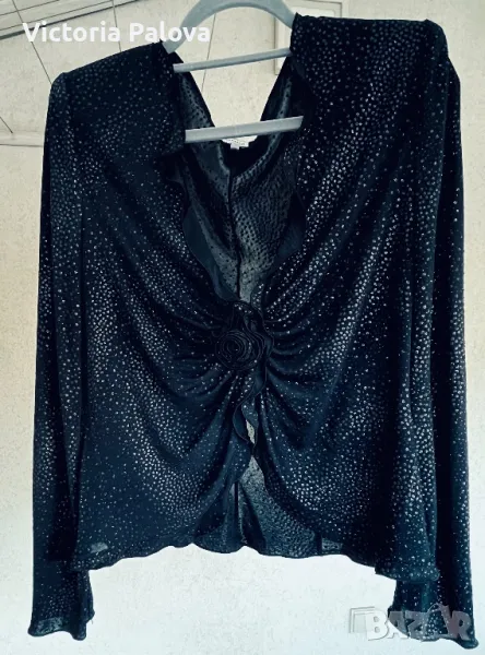 Много красива екстравагантна блуза. Рамо - от 38см до 52см - може да се нагласи по желание, ГО - 54см, дължина - 61см, ръкав - 64см. Материята е разтеглива, тежка, красиво драпирана с роза по средата отпред, по раменете е с подплънки, дискретен глитер.
