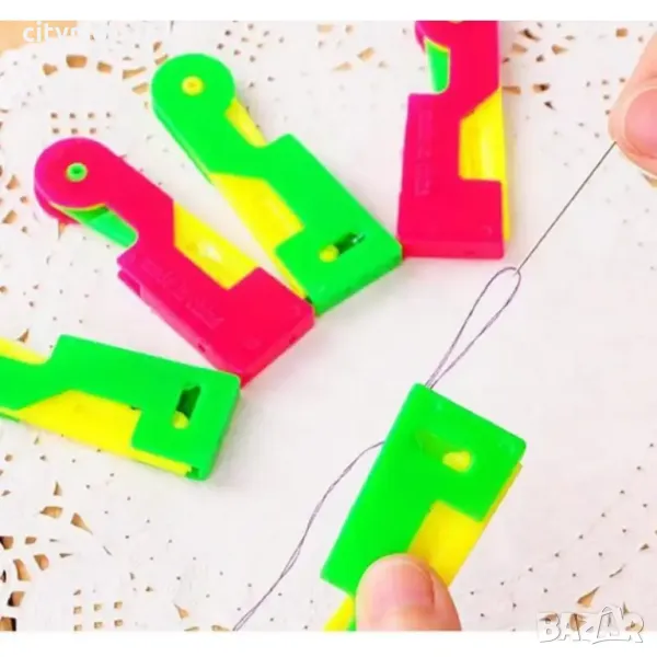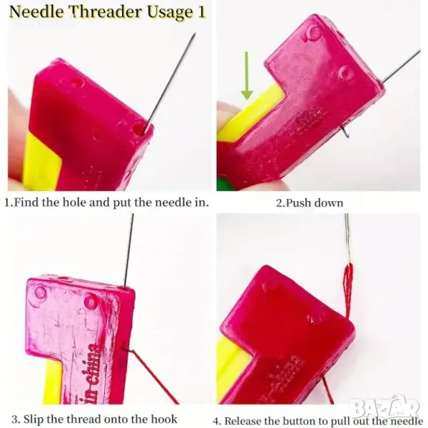 Устройство за вдяване на игла. Изработена от висококачествена пластмаса, помага за вдяване на иглата и вдяване на мъниста, подходяща за игли и мъниста с много различни размери, помага за подобряване на ефективността на ръкоделието, цветовете се предоставят на случаен принцип.
