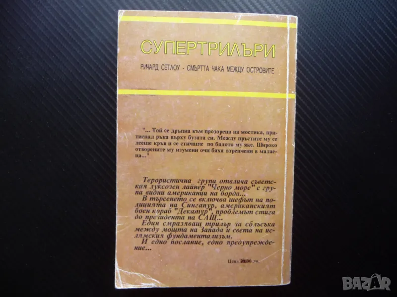 Смъртта чака между островите Ричард Сетлоу смразяващ трилър, снимка 1 - Художествена литература - 49564159 Смъртта чака между островите Ричард Сетлоу смразяващ трилър, снимка 2 - Художествена литература - 49564159 Смъртта чака между островите Ричард Сетлоу смразяващ трилър, снимка 3 - Художествена литература - 49564159 1/3