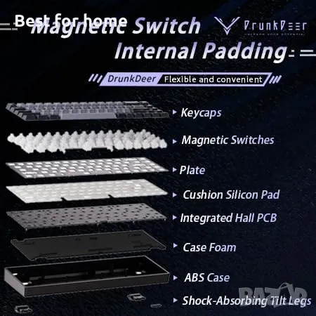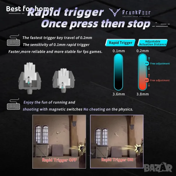 Бързо задействане: Задейства се след натискане, нулира след освобождаване. Диапазон на чувствителност 0,1-3,6 мм, регулируема точност е 0,1 мм. Плавно регулира действието на клавишите, за да позволи повторения по средата на движението, без да блокира точките на задействане. Играчите са свободни да го персонализират според нуждите си, което им дава предимство в FPS и ритъм игри като Valorant, osu!.