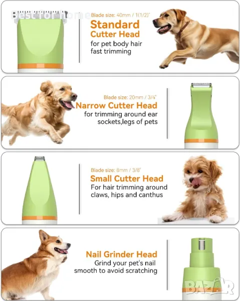- Едни и същи пари, за да получите четири: Комплектът за подстригване на кучета и котки 7116 има дизайн на подвижна режеща глава с 4 сменяеми приставки за режеща глава — стандартна режеща глава, тясна режеща глава, малка (подробна) режеща глава и глава за мелене на нокти, които могат бързо да бъдат заменени само с едно издърпване и едно натискане, за да отговорят на нуждите от подстригване на тялото на кучета и котки. Спестете парите си сега!
