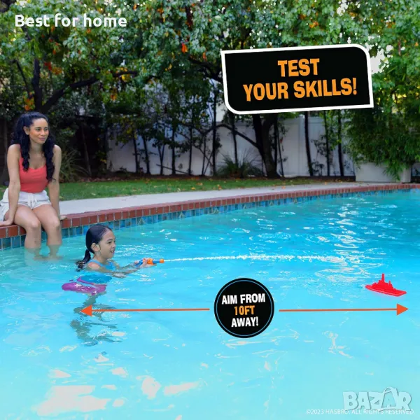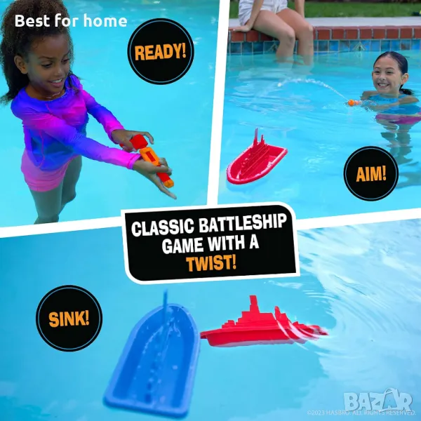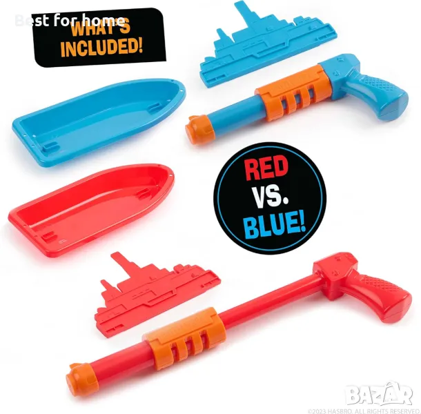 • Червено срещу. Сините бойни кораби и водните пускови установки са координирани по цвят, така че можете лесно да проследите кой кораб сте нацелили. Всеки стартер може да пръска вода над 10 фута, така че вие избирате разстоянието и трудността. Колкото по-далеч сте от бойните кораби, толкова по-трудна ще бъде играта.
