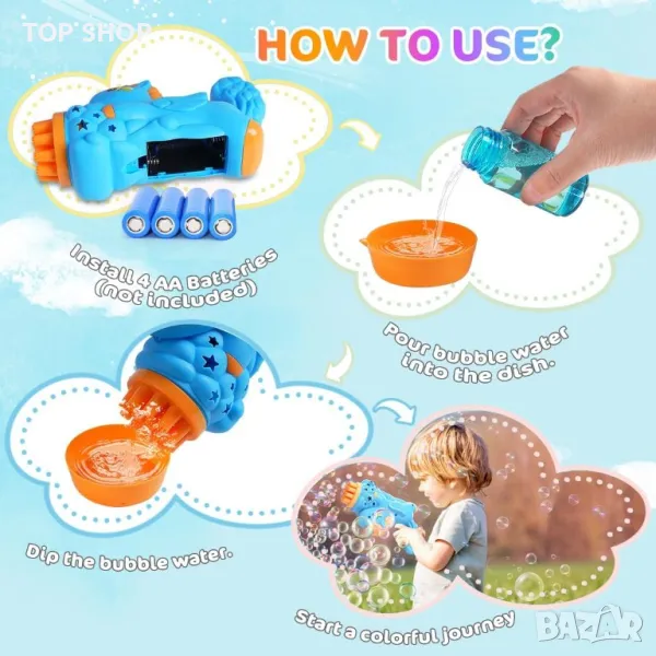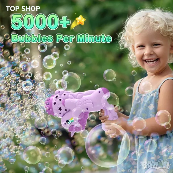 Комплект от 4 броя Bubble Guns, идеален за безкрайно забавление с мехурчета! Комплектът включва 4 пистолета за балончета, 4 бутилки с разтвор за балончета от 50 ml, 4 тави и стилна подаръчна кутия, което го прави идеален за групова игра. Пистолетите се предлагат в живи розови, сини, лилави и зелени цветове с изискан дизайн, за да привличат вниманието на децата. Всяка машина разполага с 15 отвора за мехурчета и LED светлини, създавайки ефектен дисплей с мехурчета през деня и цветно светлинно шоу през нощта. Лесен за използване, просто изсипете течност за мехурчета, поставете батерии, потопете и задействайте за магическо изживяване с мехурчета. Изработени с мисъл за безопасността, машините и течността за мехурчета са направени от висококачествени, нетоксични материали, осигуряващи безопасна и приятна игра както за деца, малки деца, домашни любимци, така и за възрастни. Направете всеки повод специален с този многофункционален и забавен комплект пистолети за мехурчета – перфектният подарък за рождени дни, партита, сватби, дипломи, годишнини и празнични тържества!